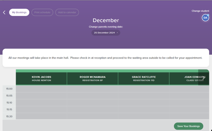 The child you are booking for will show in the top right-hand corner of the screen. If you have more than one child at our school, you will see a circle for each child. Simply click on the relevant circle to select the child you want to make a booking for.