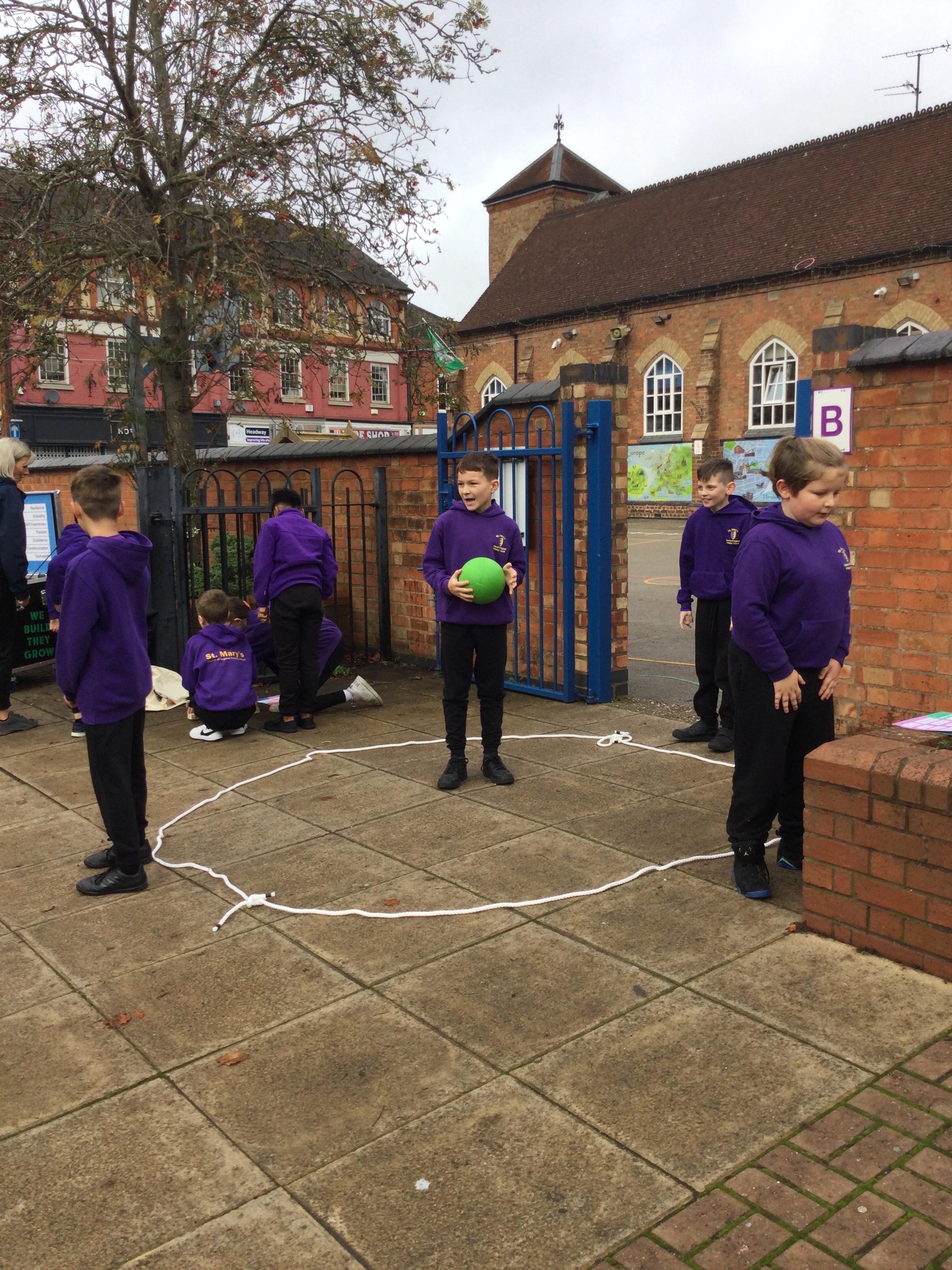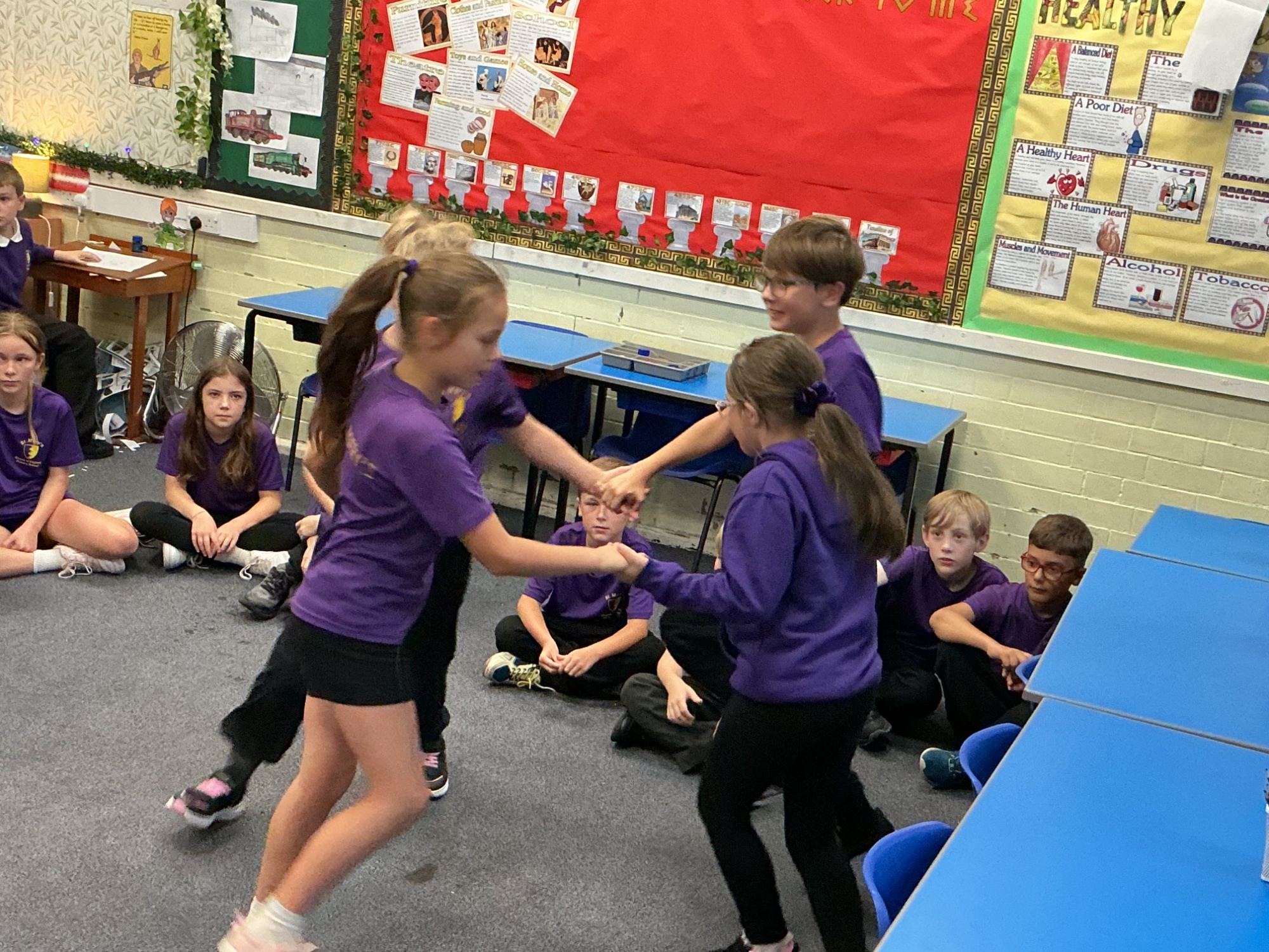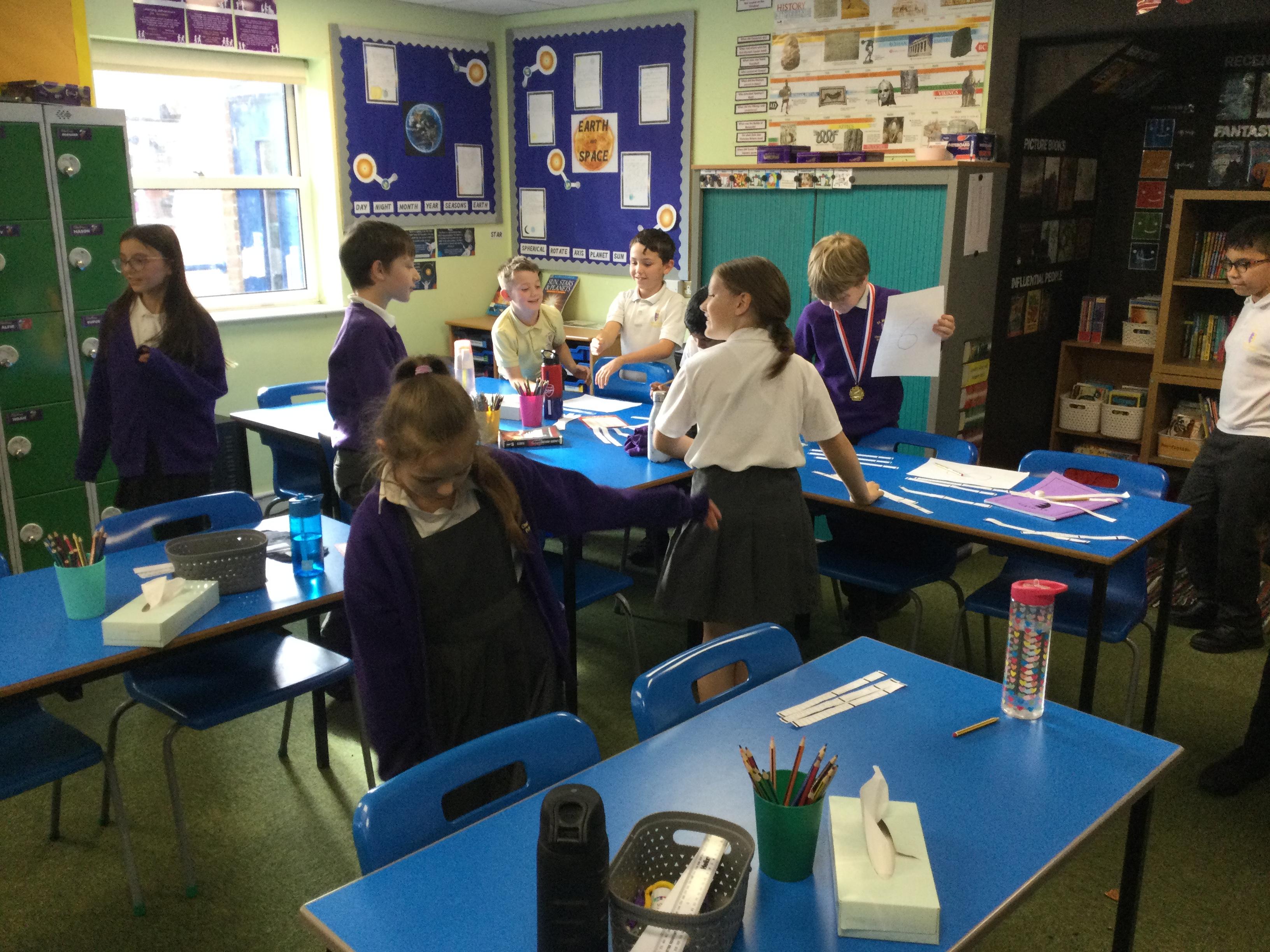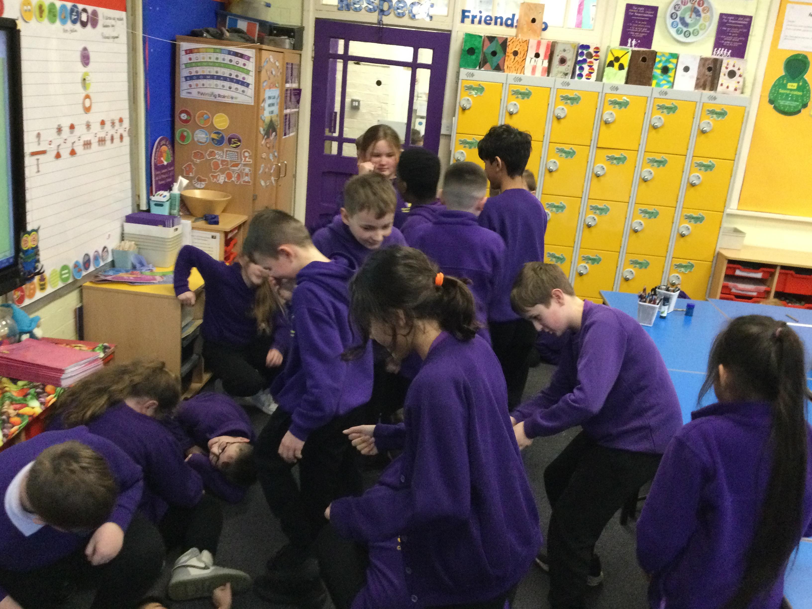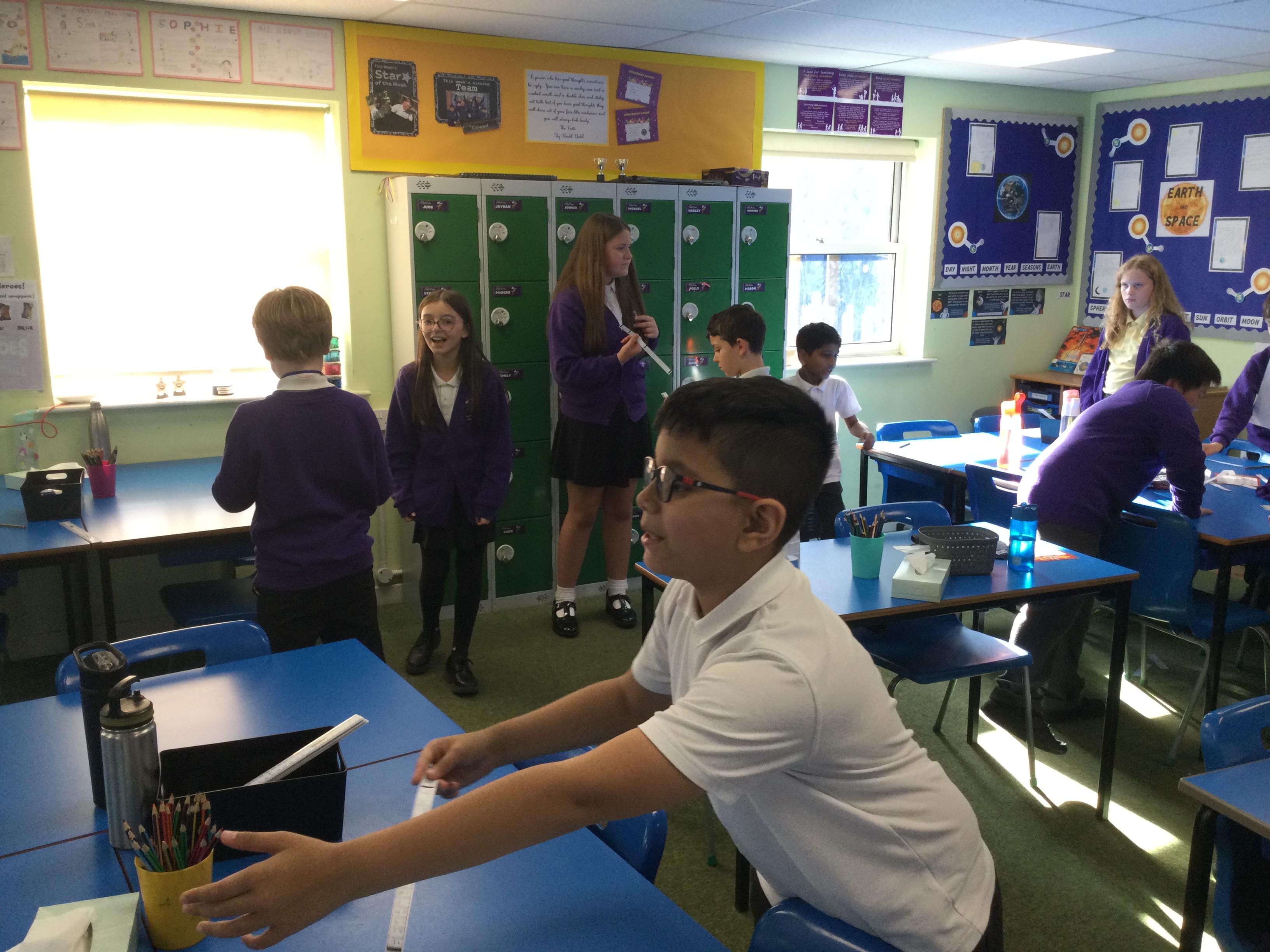 Children have been learning how computers send messages to each other through a network. The children sent 'packets' via the routers (which were the children) from one machine to another. The children were only allowed to hold one 'packet' at a time.
