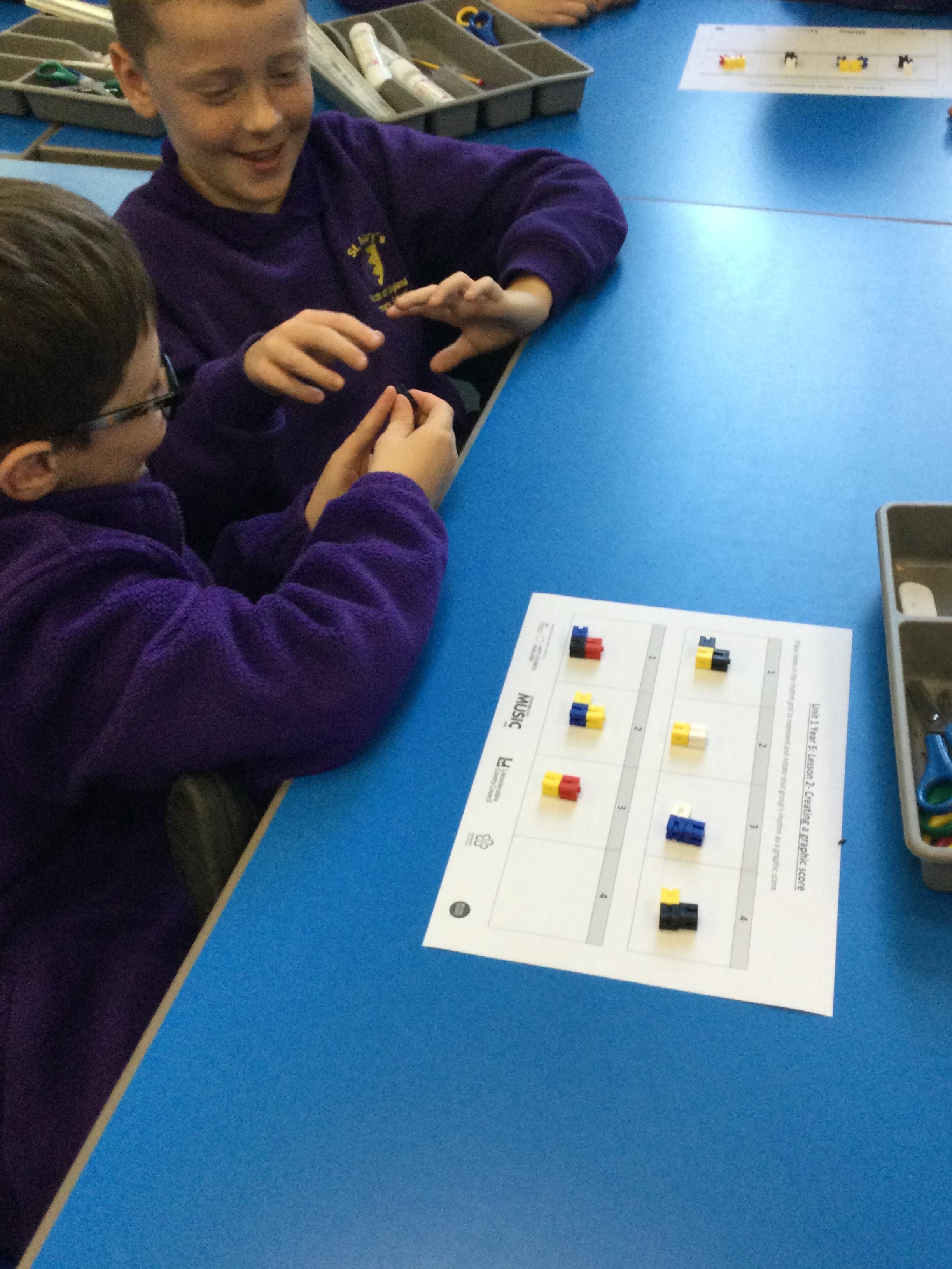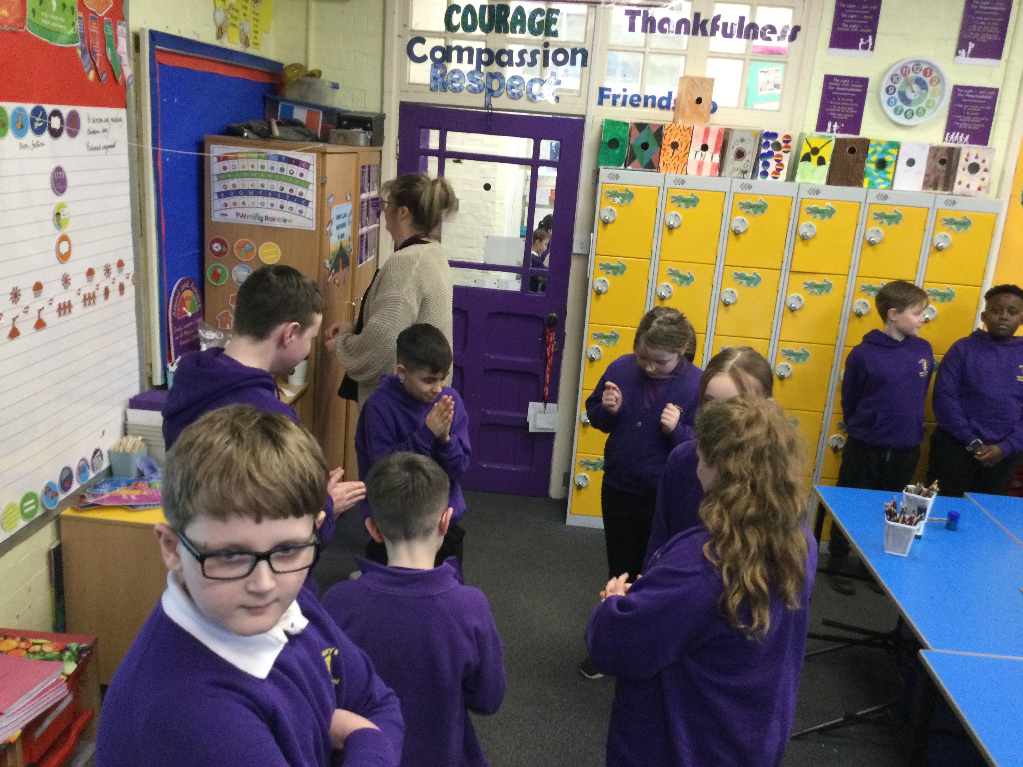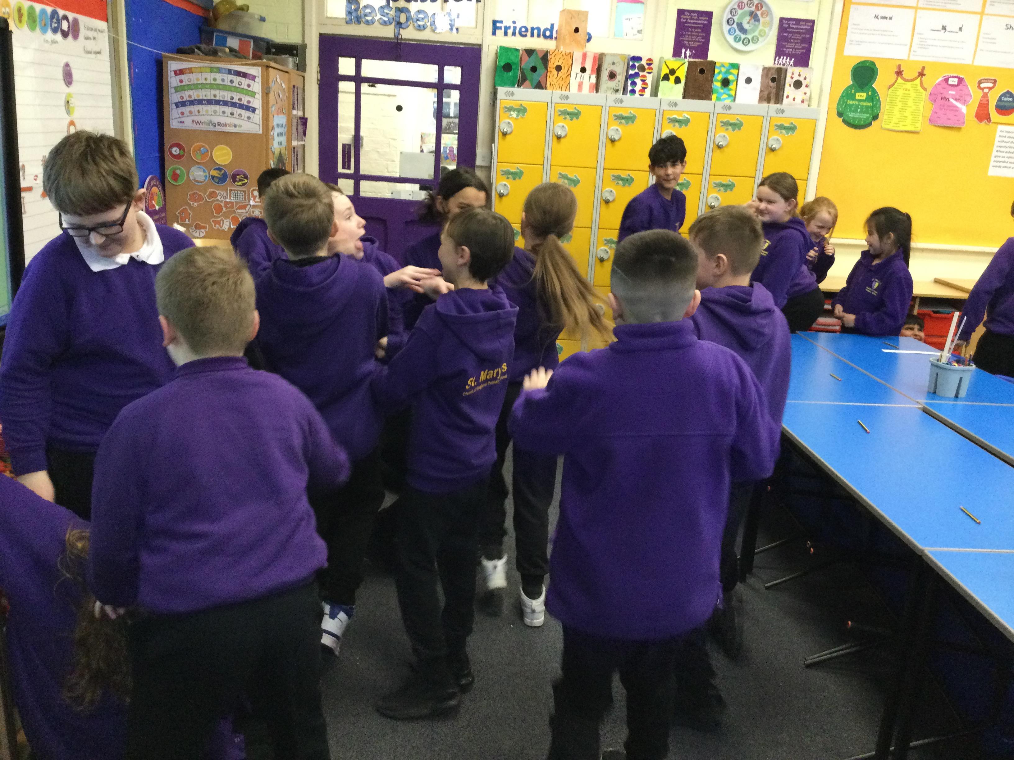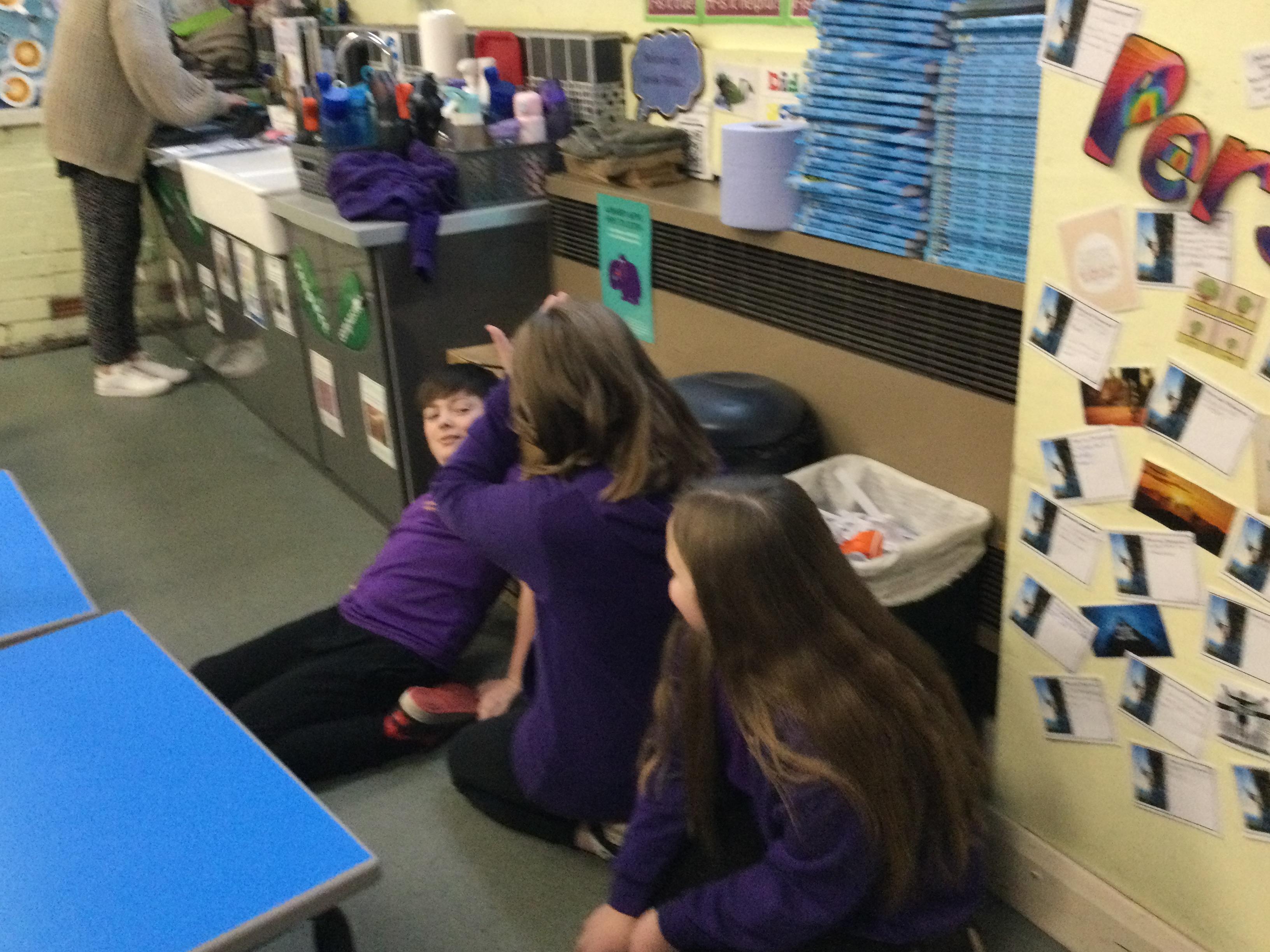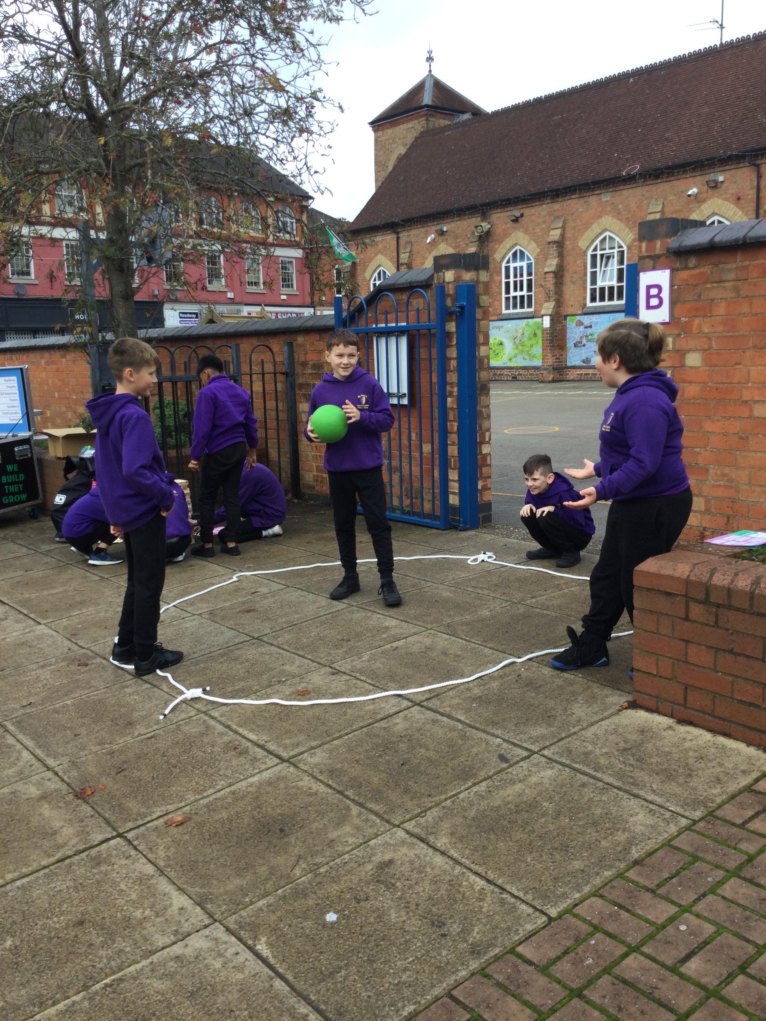Children have been learning how computers send messages to each other through a network. The children sent 'packets' via the routers (which were the children) from one machine to another. The children were only allowed to hold one 'packet' at a time.