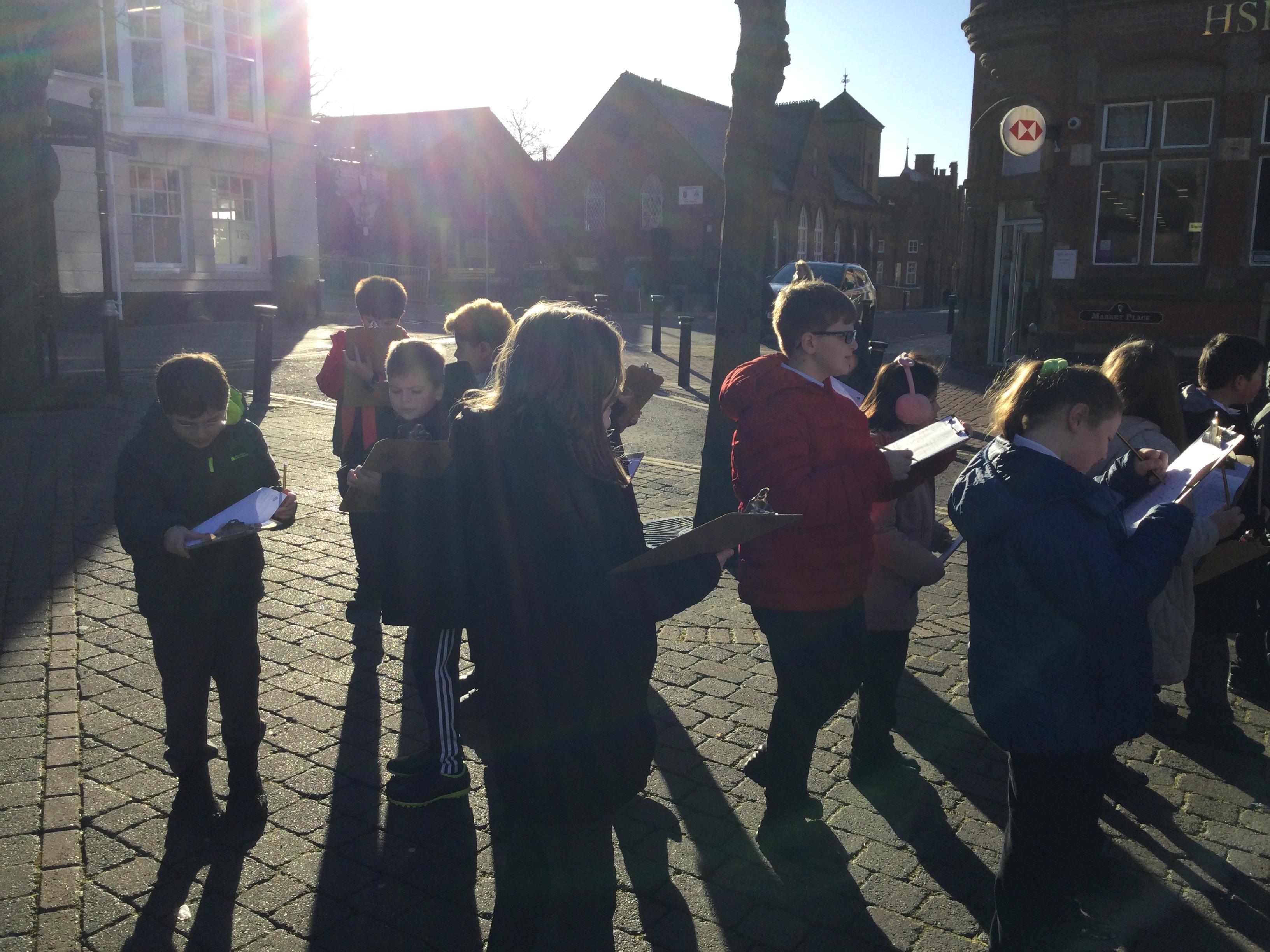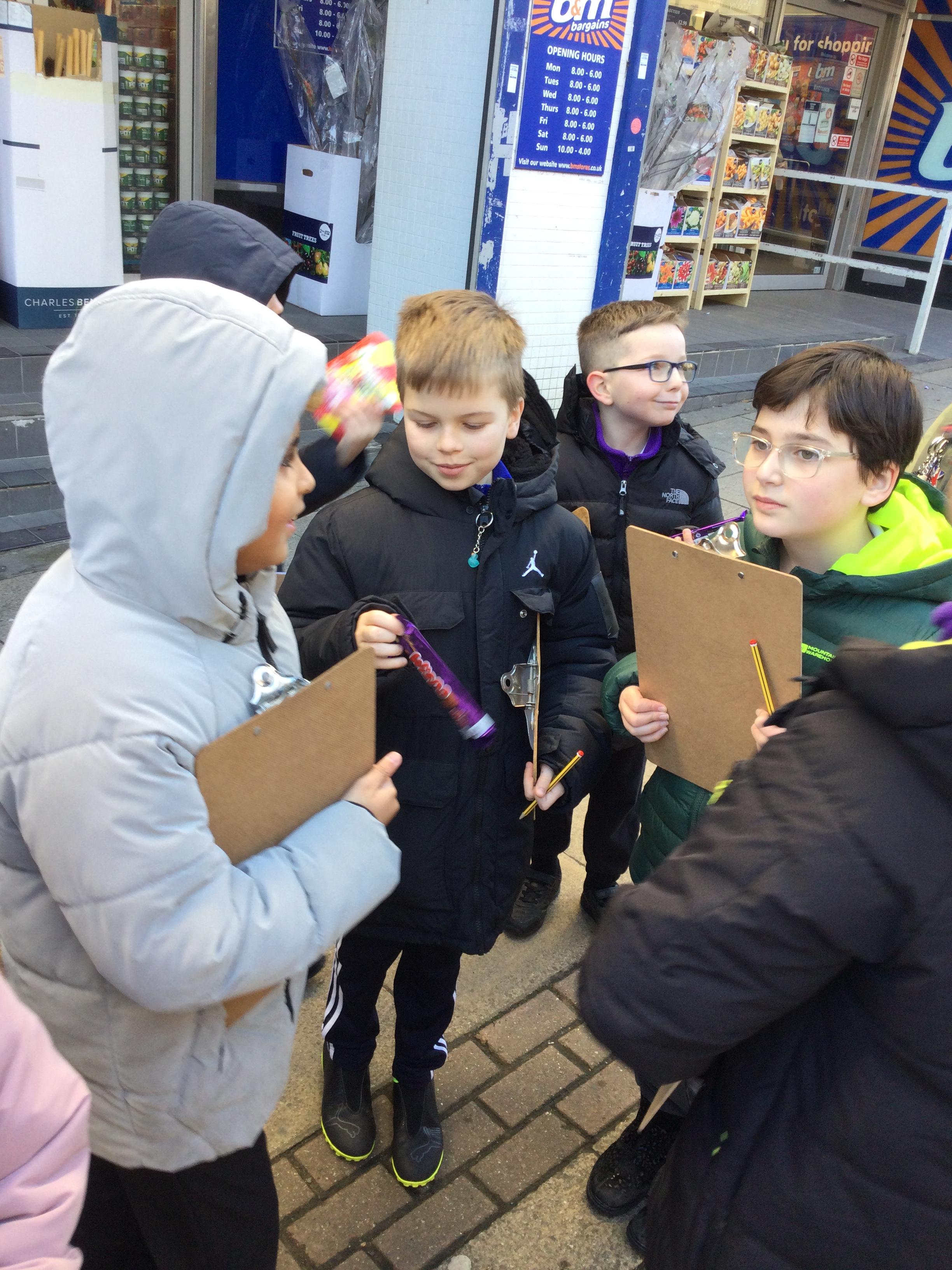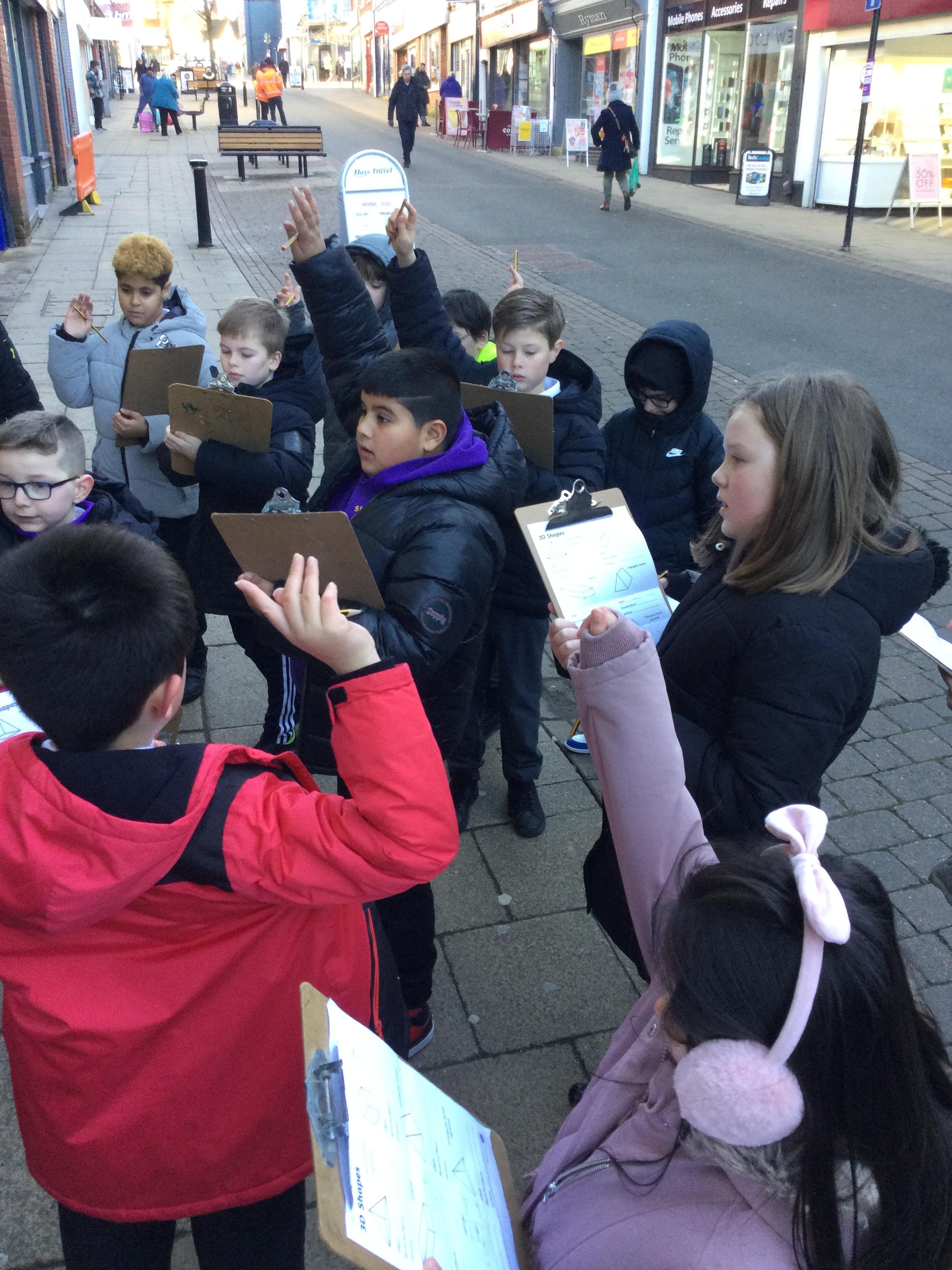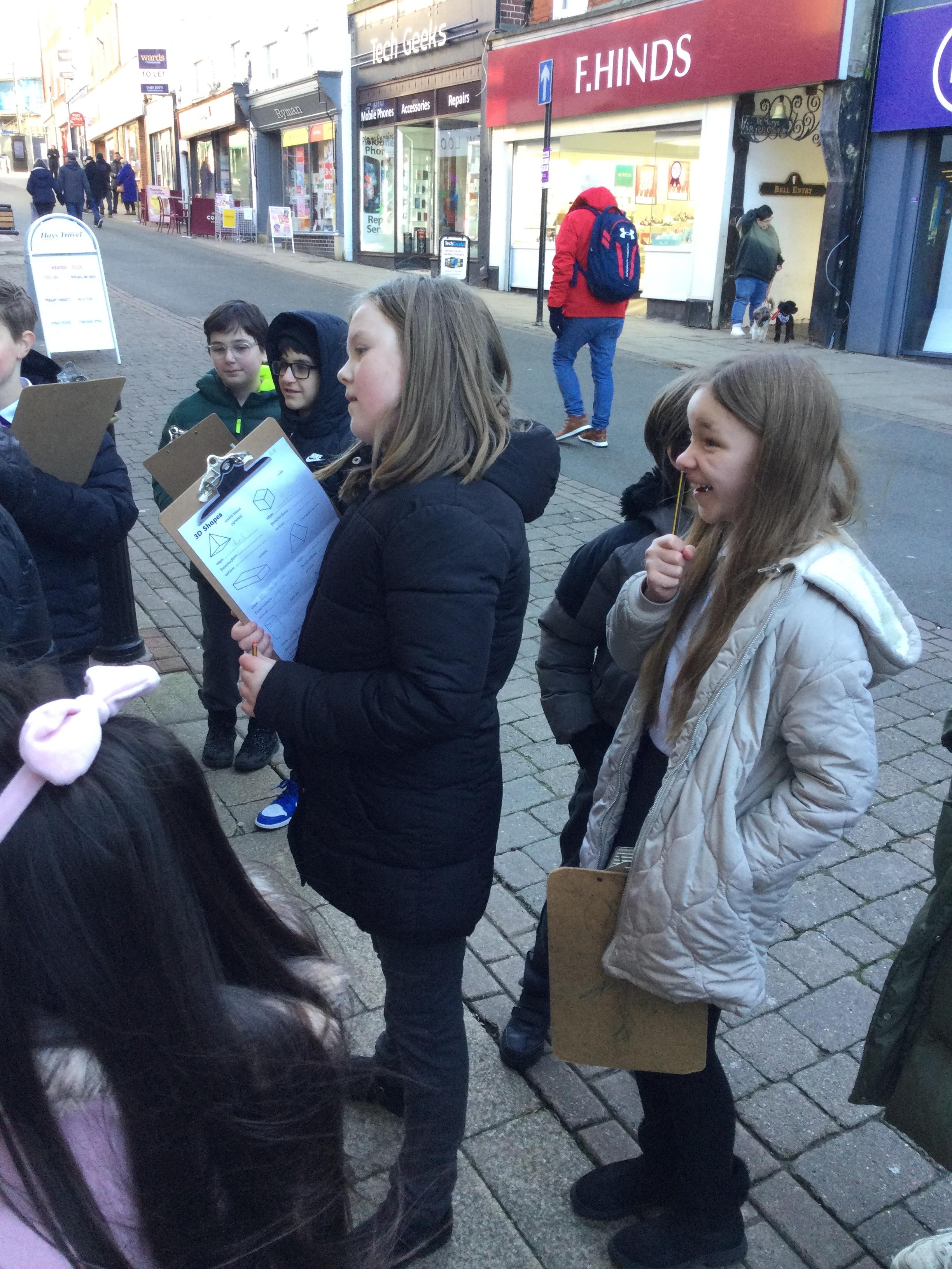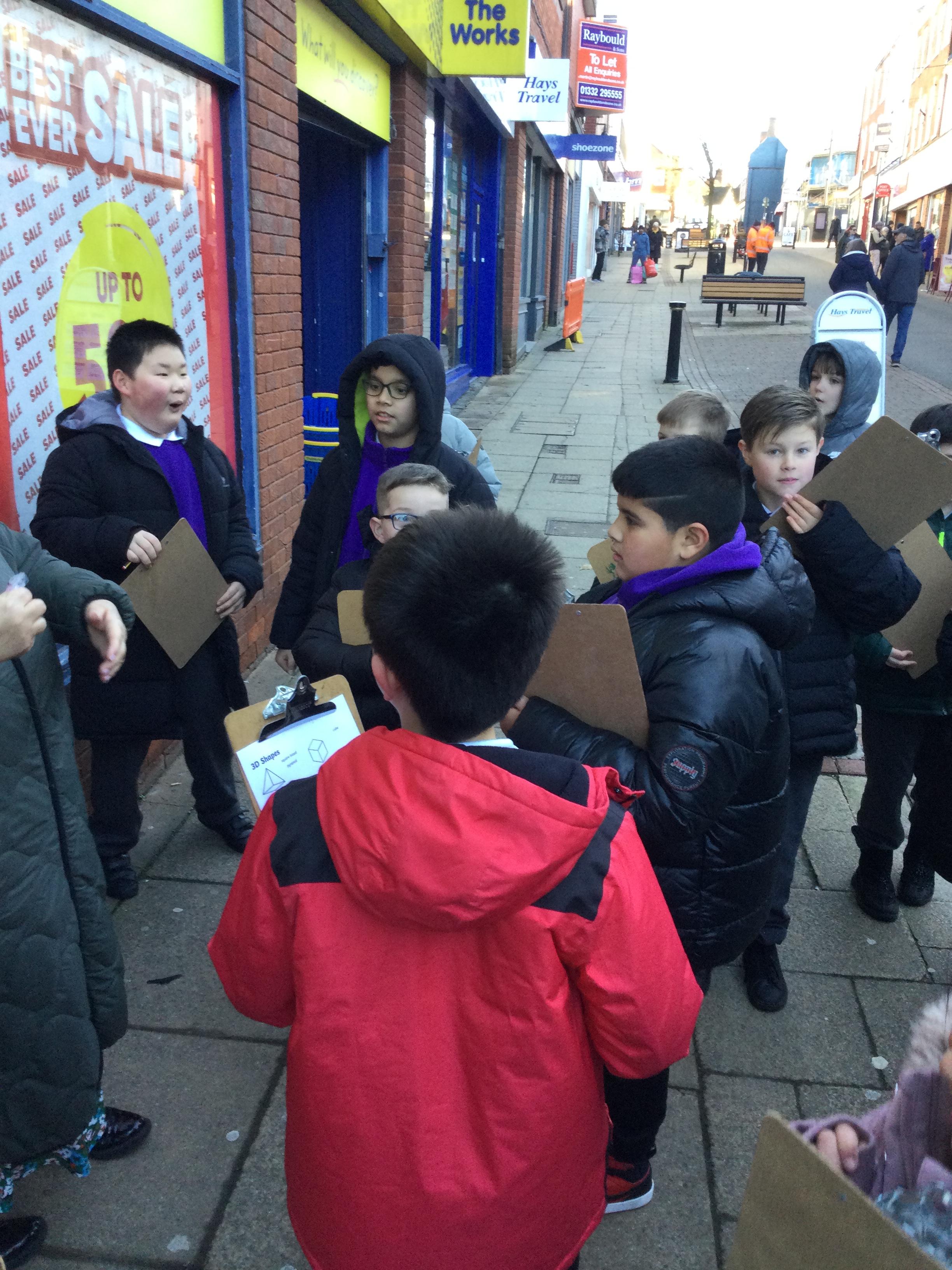 Some Year Five children were thinking about maths and how the subject came into all areas of Hinckley. We walked through the centre of Hinckley looking for evidence of maths around us. We found lots of examples from numbers and 3D shapes to percentages and money. Our favourite task was to think about how to spend one pound. We had great fun spending our money and discovered that maths was indeed all around us!