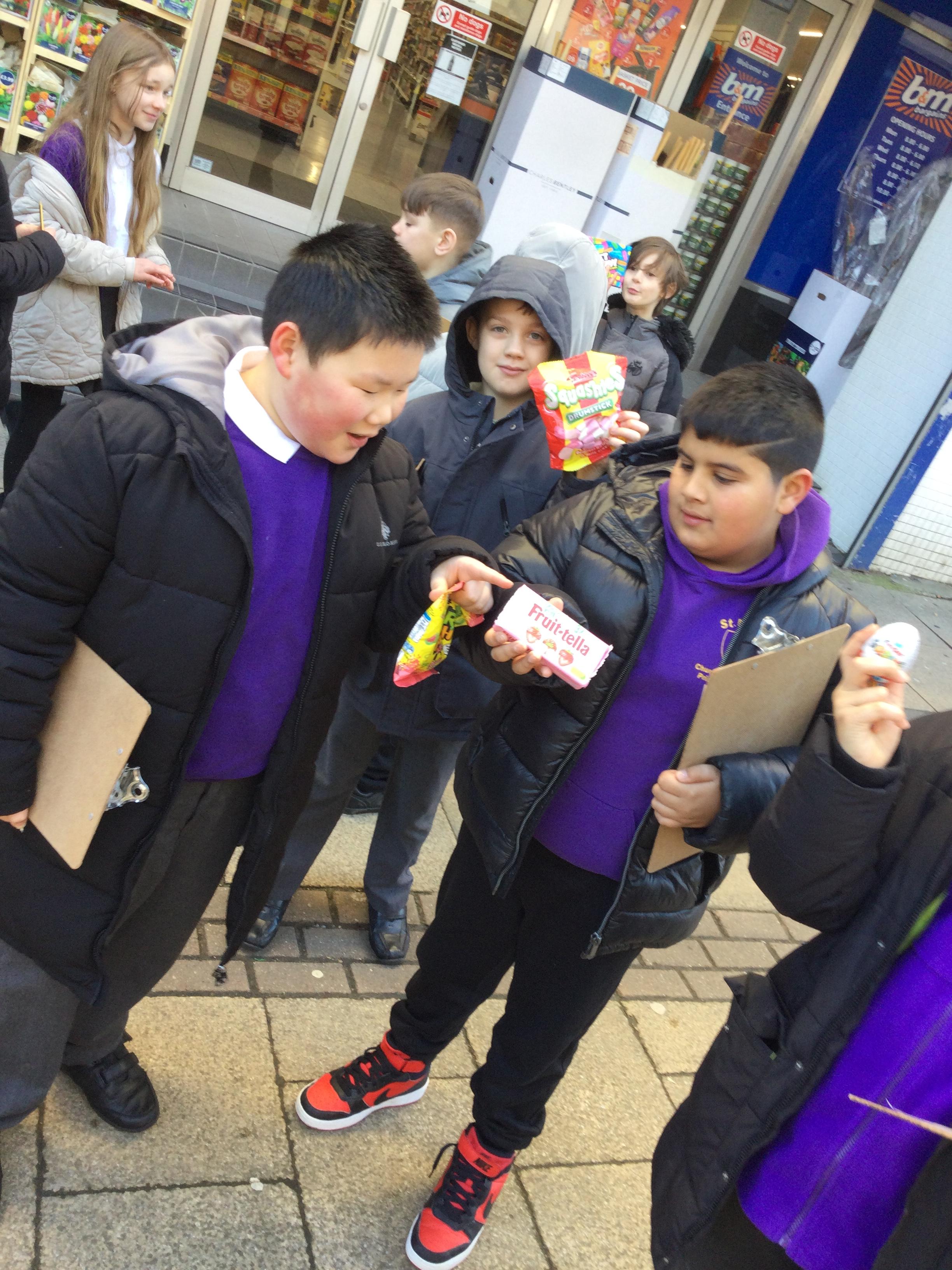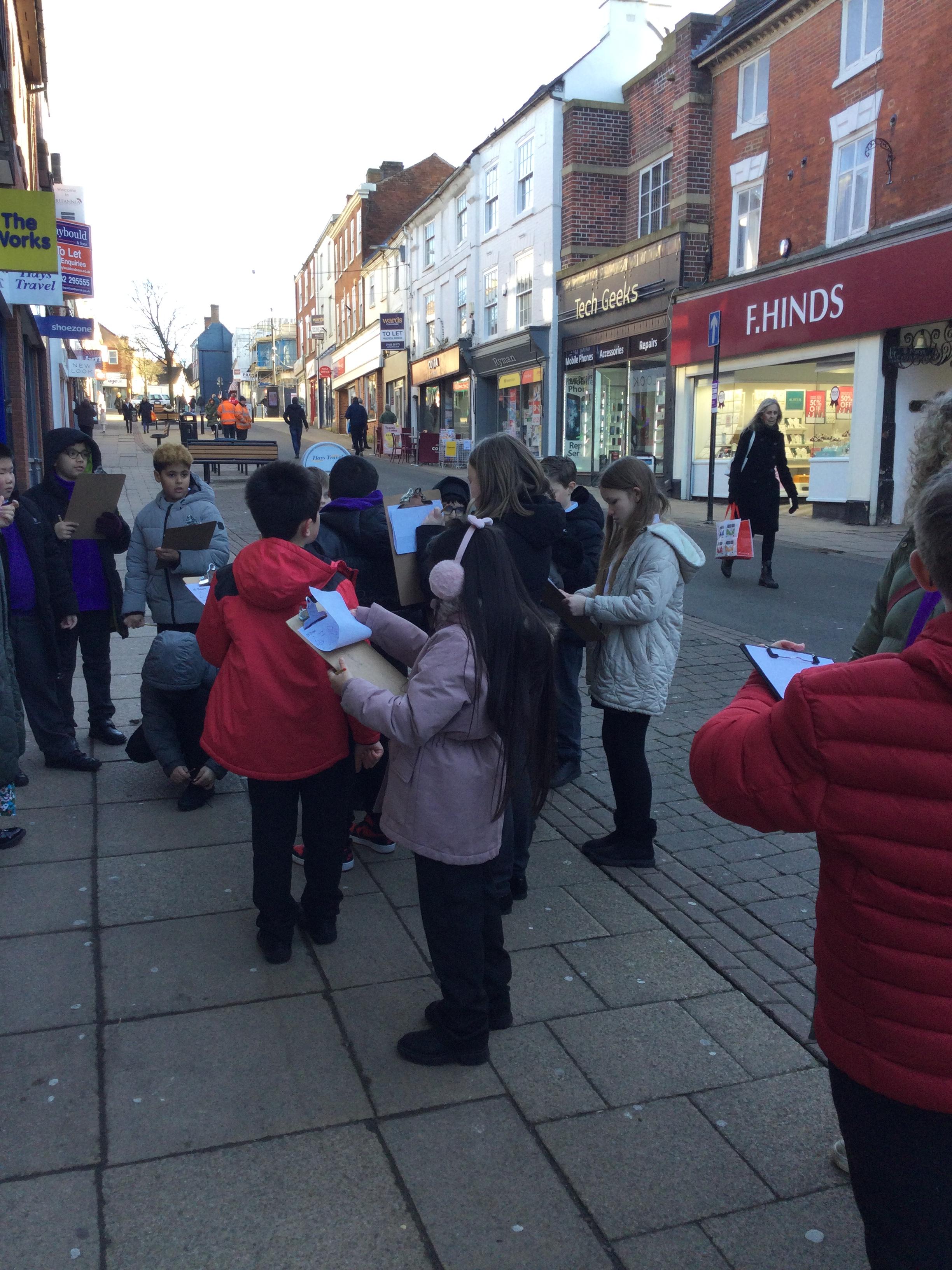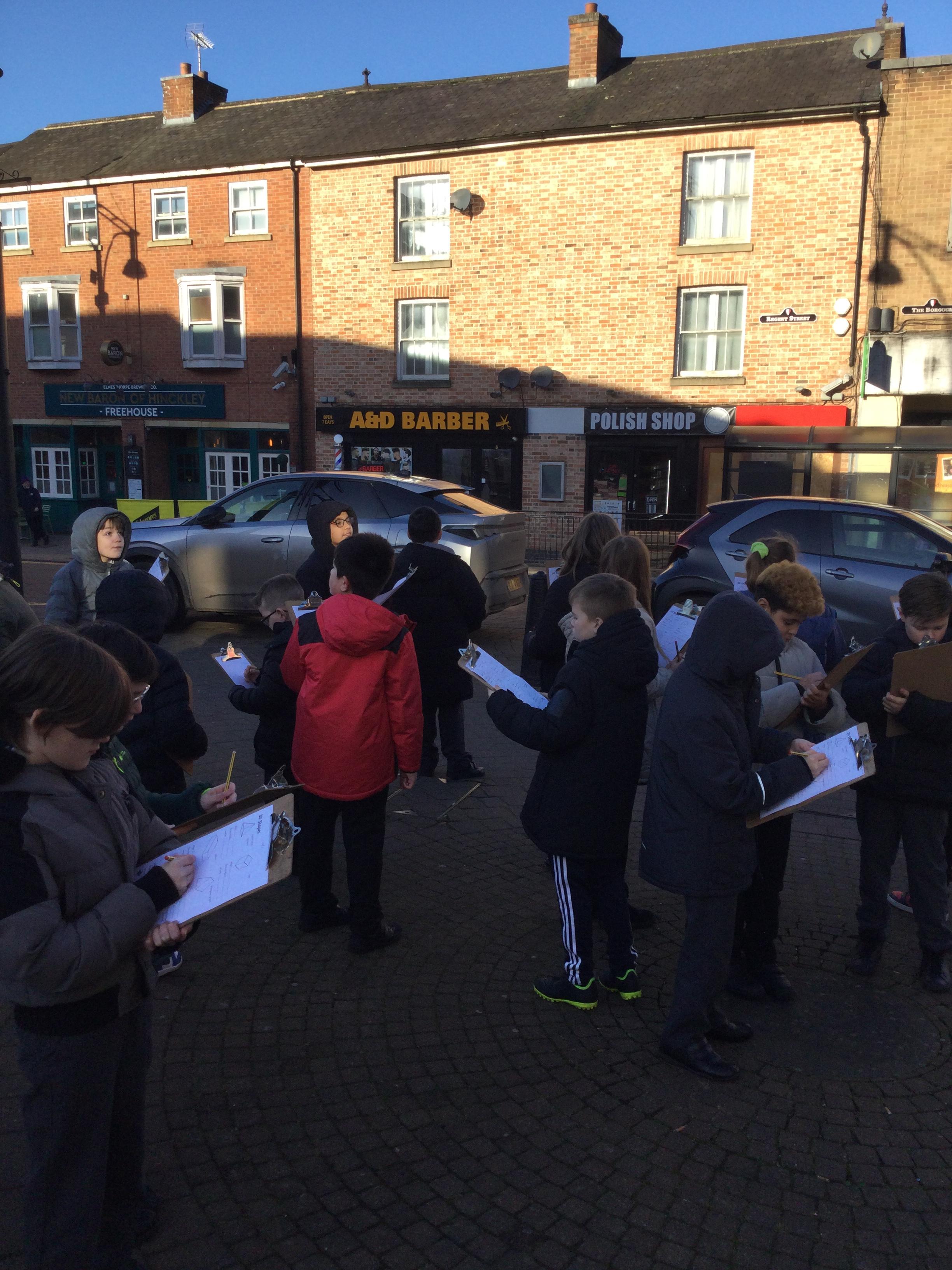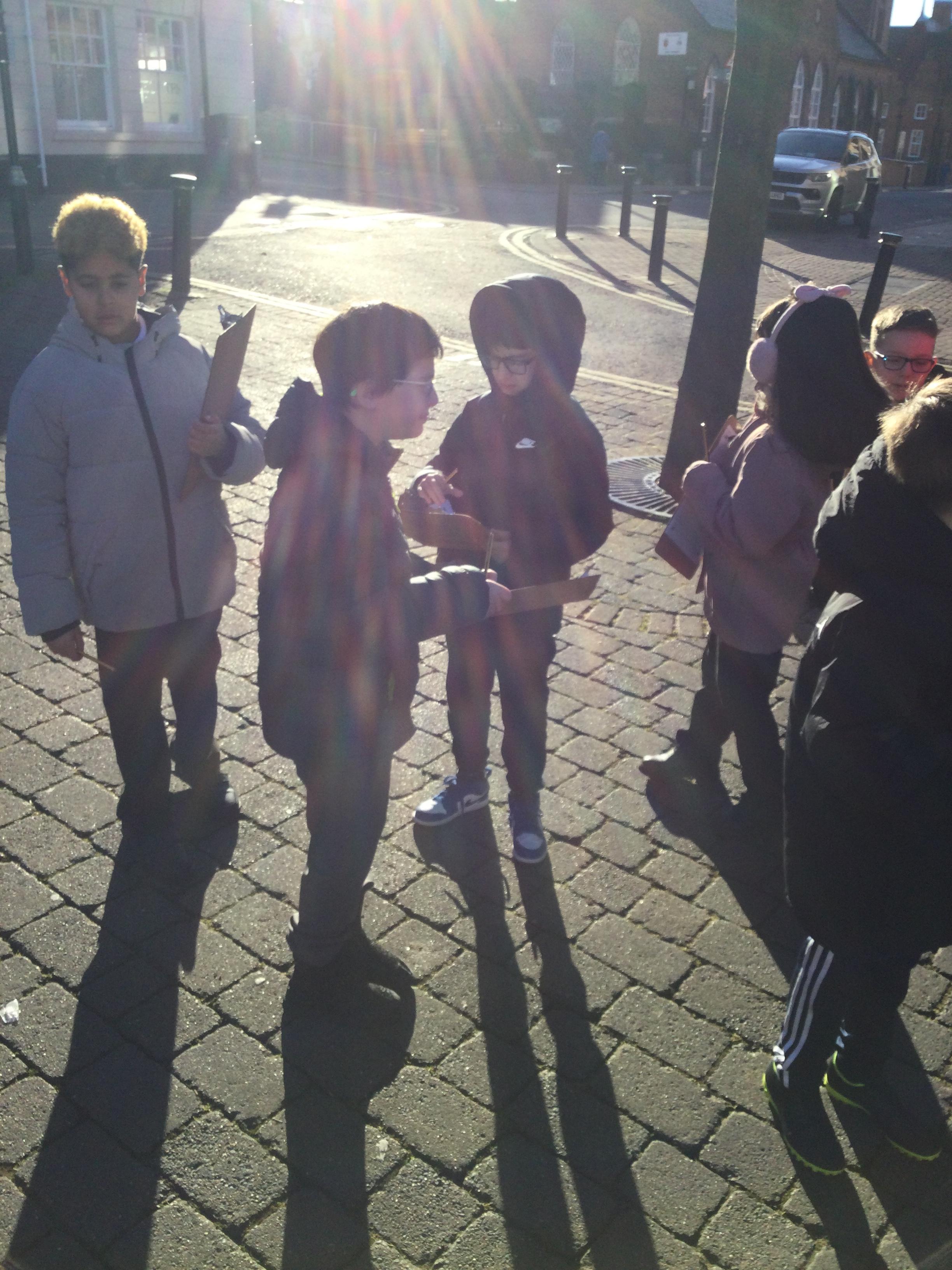 Some Year Five children were thinking about maths and how the subject came into all areas of Hinckley. We walked through the centre of Hinckley looking for evidence of maths around us. We found lots of examples from numbers and 3D shapes to percentages and money. Our favourite task was to think about how to spend one pound. We had great fun spending our money and discovered that maths was indeed all around us!